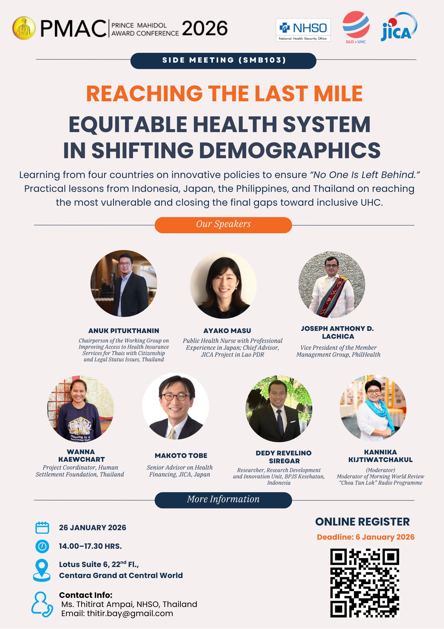 Aligned with the PMAC 2026 theme, Navigating Global Demographic Transitions through Innovative Policy: An Equity-Centered Approach, the Partnership Project for Global Health and UHC (GLO+UHC) Phase 3 and its partners are convening the side meeting Reaching the Last Mile: Equitable Health Systems in Shifting Demographics to share country experiences, foster multi-stakeholder dialogue on inclusive UHC, and generate actionable policy recommendations for life-course and demographic-sensitive health systems.
