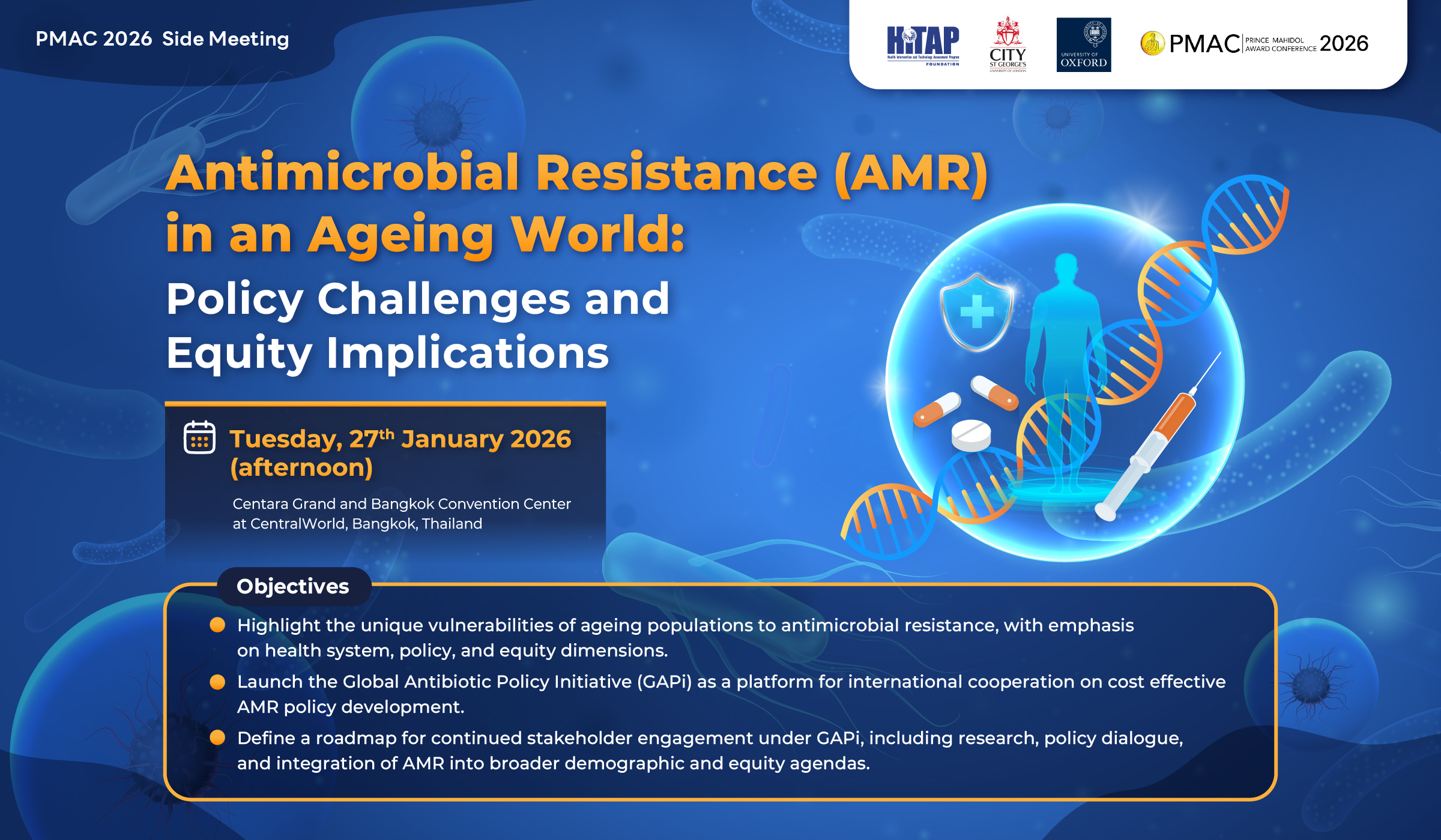 The intersection between demographic transition and antimicrobial resistance (AMR) is emerging as a critical concern. Older adults not only experience a higher incidence of infection due to physiological decline and greater exposure to healthcare settings such as hospitals and long-term care, but they are also more vulnerable to the adverse outcomes of resistant infections. As populations age, the prevalence of multimorbidity rises, which sharply increases healthcare utilization, societal costs, and long-term care and long-stay residential care costs. Recent research shows that the burden of AMR mortality is rising, especially in older age groups, with a projected sharp increase in deaths among those over 70 by mid-century. Moreover, long-term care facilities are often hotspots of inappropriate antibiotic prescribing and suboptimal infection prevention and control, further fueling the spread of multidrug-resistant organisms among elderly residents. Equity implications are profound: older people in low- and middle-income countries (LMICs), rural or marginalised communities, or with limited access to diagnostics and high-quality health care bear a disproportionate share of risk, and risk being left further behind unless policies are tailored to meet their specific needs. The Global Antibiotic Policy Initiative (GAPi) is collaborative project that aims to derive standard methods to inform policy makers on the most cost effective interventions that achieve optimal antibiotic use to combat AMR across multiple countries. As part of this Thailand-UK led initiative, open access tools that can guide prioritisation of the AMR policy agenda will be developed. This is expected to strengthen the use of evidence in health decision making to tackle the challenge of AMR, and strengthen health systems in the context of changing demographics.